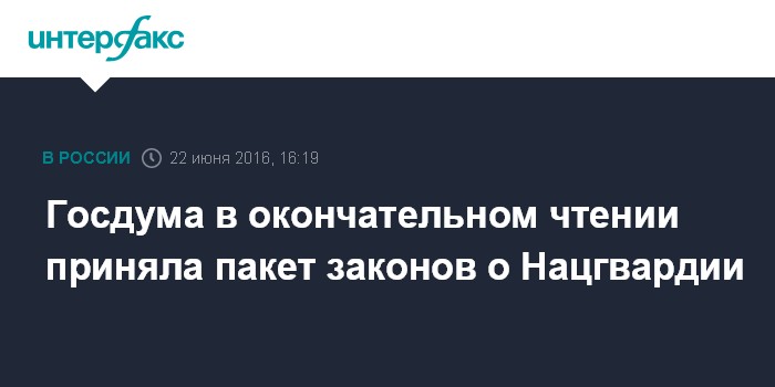 Москва. 22 июня. INTERFAX.RU - Госдума на заседании в среду приняла в третьем окончательном чтении пакет законов о создании в России Национальной гвардии, которая заменит Внутренние войска МВД.