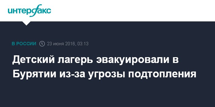 Москва. 23 июня. INTERFAX.RU - В Джидинском районе Бурятии эвакуировали детей из детского оздоровительного лагеря "Черемушки" из-за угрозы подтопления, сообщает в четверг пресс-служба республиканского ГУ МЧС.