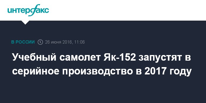 Москва. 26 июня. INTERFAX.RU - Самолет для первоначальной летной подготовки Як-152 планируется запустить в серийное производство в марте 2017 года, сообщил главком ВКС РФ Виктор Бондарев.