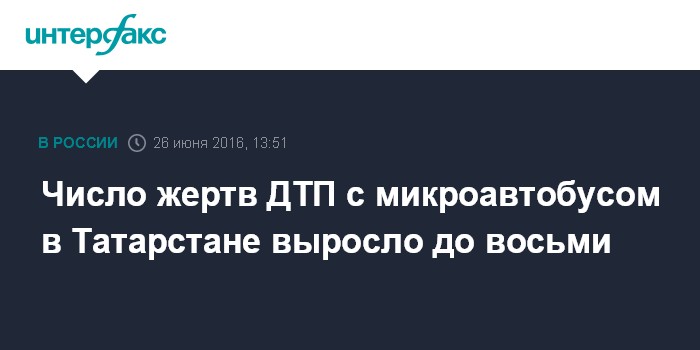 Москва. 26 июня. INTERFAX.RU - Скончался еще один из пострадавших в автокатастрофе с участием микроавтобуса в Тюлячинском районе Татарстана, число жертв аварии выросло до восьми.