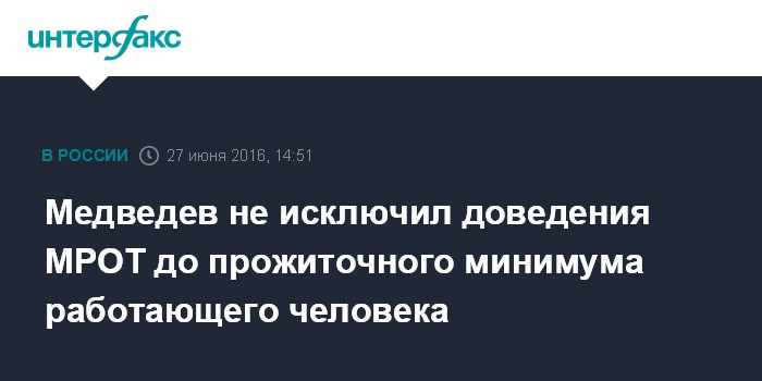 Москва. 27 июня. INTERFAX.RU - Минимальный размер оплаты труда к 2020 году может достичь уровня прожиточного минимума, заявил глава российского правительства Дмитрий Медведев.