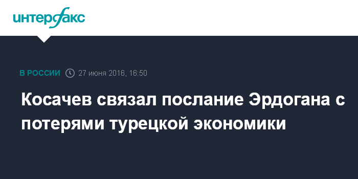 Москва. 27 июня. INTERFAX.RU - Послание Реджепа Эрдогана президенту РФ Владимиру Путину связано с потерями турбизнеса Турции, и это лишь первый шаг к налаживанию отношений двух государств, заявил глава комитета Совета Федерации по международным делам Константин Косачев.