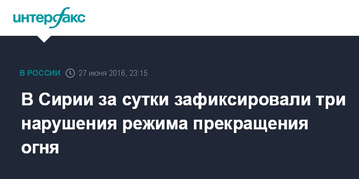 Москва. 27 июня. INTERFAX.RU - За прошедшие сутки режим тишины в Сирии нарушался трижды в провинции Дамаск, говорится в бюллетене российского центра по примирению враждующих сторон в Сирии, который размещен на сайте российского военного ведомства.