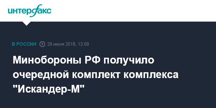 Москва. 28 июня. INTERFAX.RU - Очередной комплект оперативно-тактического ракетного комплекса "Искандер-М", предназначенный для оснащения ракетной бригады, передан Минобороны РФ, сообщает пресс-служба НПК "Конструкторское бюро машиностроения".