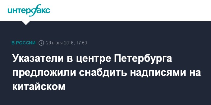 Москва. 28 июня. INTERFAX.RU - В правительстве Санкт-Петербурга прорабатывается идея дублирования указателей в историческом центре переводом на китайский язык, сообщили "Интерфаксу" в пресс-службе городского комитета по развитию туризма во вторник.