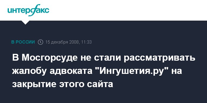 Москва. 15 декабря. INTERFAX.RU - Надзорная инстанция Мосгорсуда не стала рассматривать жалобу представителей сайта "Ингушетия.ру" на решение о прекращении деятельности портала.