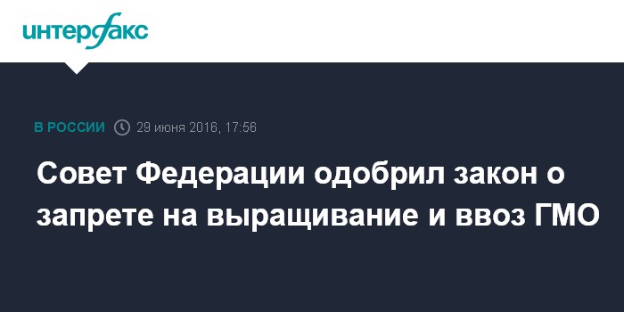 Москва. 29 июня. INTERFAX.RU - Совет Федерации на заседании в среду одобрил закон, вводящий запрет на выращивание и разведение в РФ генно-инженерно-модифицированных растений и животных, исключение делается для случаев проведения научных работ.