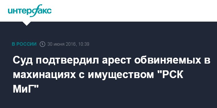 Суд подтвердил арест обвиняемых в махинациях с имуществом "РСК МиГ"