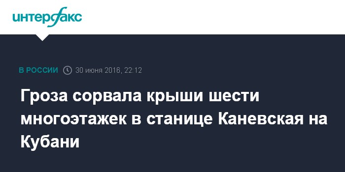 Москва. 30 июня. INTERFAX.RU - Сильный ветер во время грозы в четверг вечером повредил крыши шести многоквартирных жилых домов в станице Каневская Краснодарского края, сообщили агентству "Интерфакс" в пресс-службе ГУ МЧС РФ по краю.