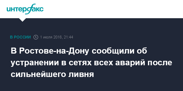 Москва. 1 июля. INTERFAX.RU - Все аварии на электросетях и газопроводах, возникшие из-за сильного ливня, обрушившегося на Ростов-на-Дону в минувший четверг, полностью ликвидированы.