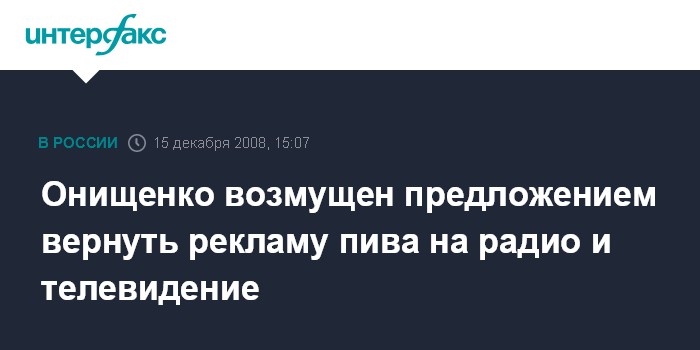 Москва. 15 декабря. INTERFAX.RU - Верхом цинизма назвал глава Роспотребнадзора Геннадий Онищенко предложения временно снять ограничения по рекламе пива на телевидении, радио и в печатных изданиях, чтобы спасти СМИ в условиях финансового кризиса.