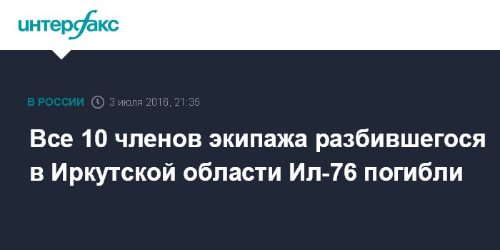 Самолет Ил-76, который был занят в тушении масштабных природных пожаров в Иркутской области, 1 июля в 06:30 мск не вышел на связь. По данным МЧС, на борту находились 10 человек. Наземная группа спасателей 3 июля обнаружила разбившийся Ил-76 южнее населенного пункта Рыбный Уян на склоне одной из сопок.