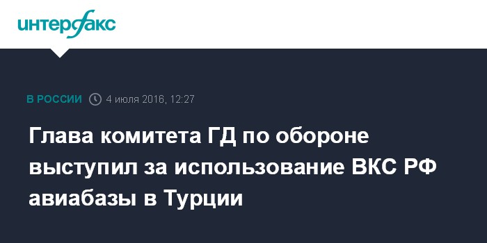 Москва. 4 июля. INTERFAX.RU - Россия может согласиться на предложение Турции об использовании базы "Инджирлик", сообщил "Интерфаксу" в понедельник глава думского комитета по обороне, экс-командующий Черноморским флотом РФ адмирал Владимир Комоедов.