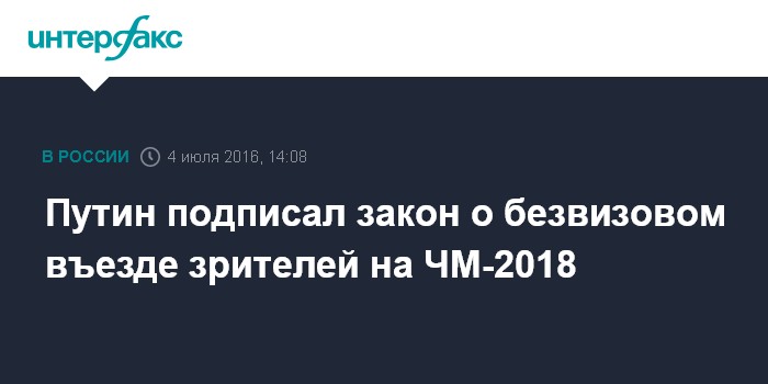 Москва. 4 июля. INTERFAX.RU - Президент РФ Владимир Путин подписал закон о безвизовом въезде в РФ зрителей на чемпионат мира по футболу в 2018 году, который также обеспечивает остальным лицам, включенным в списки FIFA, права на упрощенное и бесплатное оформление виз.