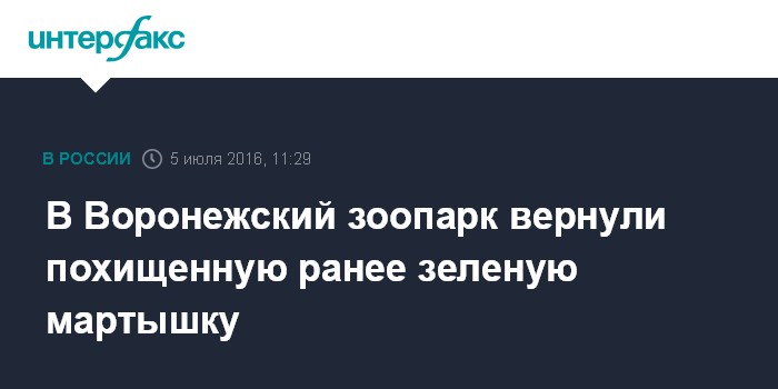 Москва. 5 июля. INTERFAX.RU - В Воронежский зоопарк вернули зеленую мартышку, которая была украдена в середине июня, сообщает областной департамент природных ресурсов и экологии.