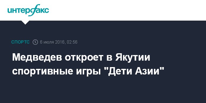 Москва. 6 июля. INTERFAX.RU - Премьер-министр РФ Дмитрий Медведев в среду в Якутске откроет VI Международные спортивные игры "Дети Азии", сообщил департамент пресс-службы и информации правительства.