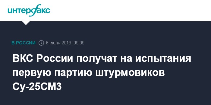 Москва. 6 июля. INTERFAX.RU - Первая партия из нескольких строевых штурмовиков Су-25, модернизированных в версию Су-25СМ3, будет поставлена ВКС России в этом месяце, сообщил "Интерфаксу" источник в авиапроме.