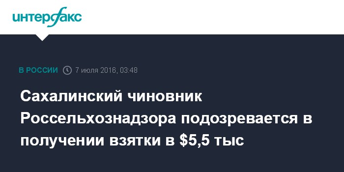 Сахалинский чиновник Россельхознадзора подозревается в получении взятки в $5,5 тыс