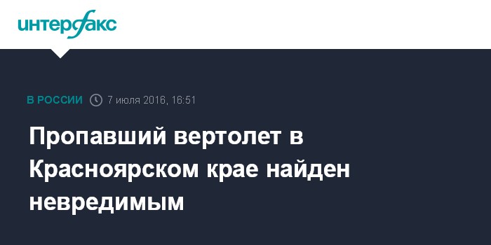 Москва. 7 июля. INTERFAX.RU - Вертолет "Робинсон-44", не вышедший вовремя на связь в Красноярском крае, обнаружен невредимым на площадке под Абаканом, сообщил "Интерфаксу" источник в экстренных службах.