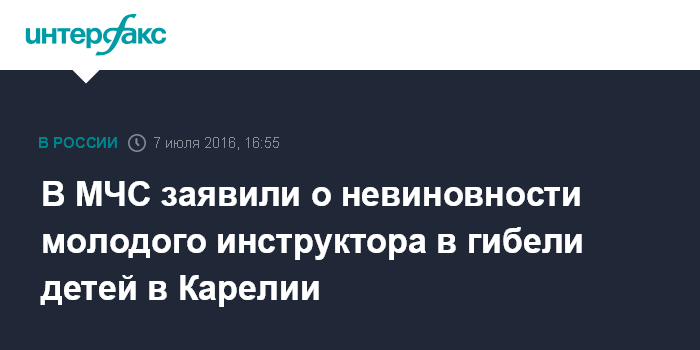 Москва. 7 июля. INTERFAX.RU - В МЧС Карелии не считают 19-летнего инструктора Валерия Круподерщикова виновным в гибели 14 детей на Сямозере, заявил глава ГУ МЧС по республике Сергей Шугаев.