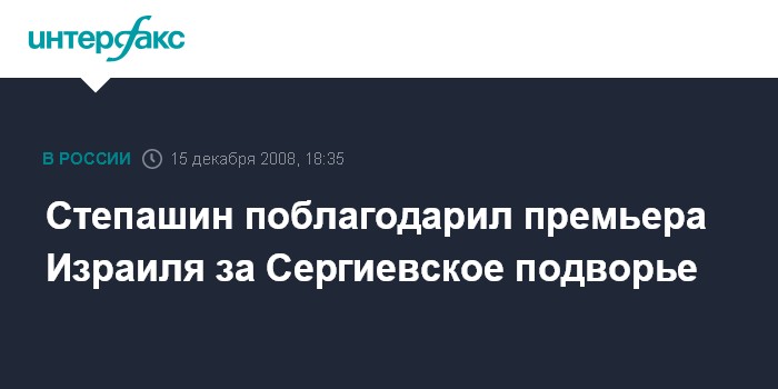 Москва. 15 декабря. INTERFAX.RU - Передачу Сергиевского подворья в Иерусалиме в собственность России обсудили в Израиле председатель Счетной палаты РФ, председатель Императорского Православного Палестинского Общества (ИППО) Сергей Степашин и премьер-министр Израиля Эхуд Ольмерт.