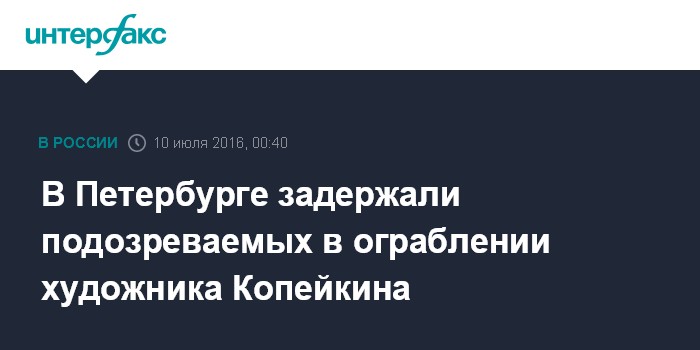 Москва. 10 июля. INTERFAX.RU - Двое мужчин задержаны по подозрению в избиении и ограблении художника Николая Копейкина в Петербурге, сообщает пресс-служба ГУ МВД по региону.