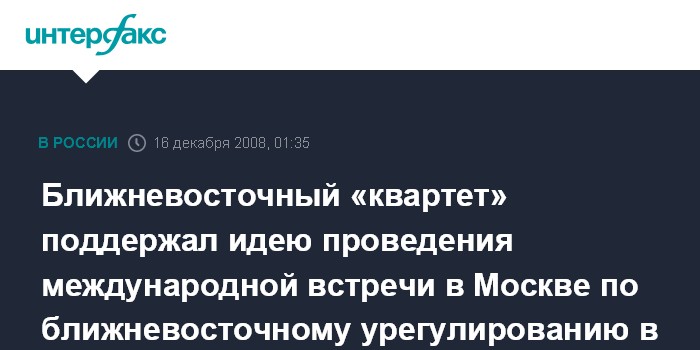 Нью-Йорк. 16 декабря. ИНТЕРФАКС - Ближневосточный "квартет" поддержал идею проведения международной встречи по урегулированию на Ближнем Востоке в Москве в 2009 году.