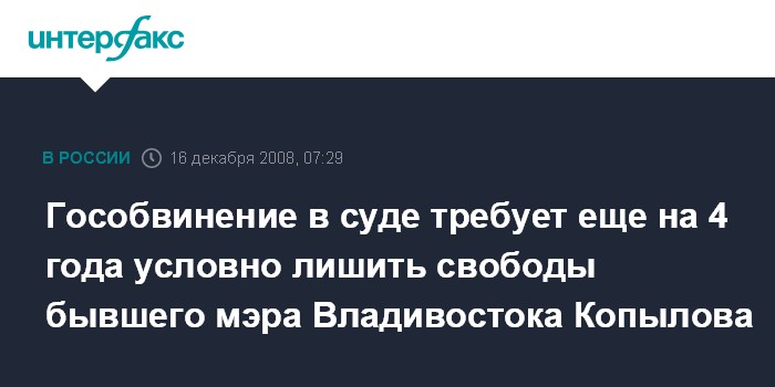 Владивосток. 16 декабря. ИНТЕРФАКС - ДАЛЬНИЙ ВОСТОК - В Ленинском суде Владивостока завершается судебное слушание очередного уголовного дела по обвинению экс-мэра города Юрия Копылова в злоупотреблении полномочиями (ч. 2 ст. 285 УК РФ).