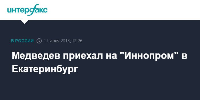 Москва. 11 июля. INTERFAX.RU - Премьер-министр РФ Дмитрий Медведев прибыл в Екатеринбург, где примет участие в работе стратегической сессии "Industry + Internet" VII международной промышленной выставки "Иннопром".