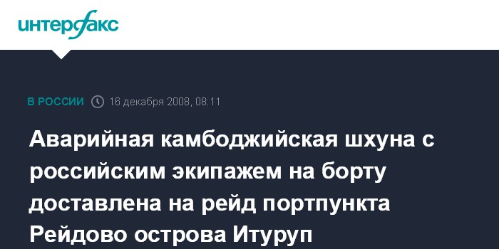 Москва. 16 декабря. INTERFAX.RU - Экипаж аварийной шхуны "Агат-1" под флагом Камбоджи, которая стоит на рейде в портпункте Рейдово (о. Итуруп, средние Курилы), собственными силами пытается отремонтировать судно.