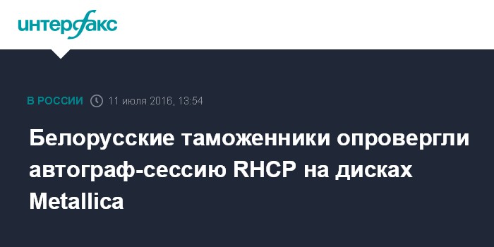 Москва. 11 июля. INTERFAX.RU - Белорусские таможенники не имеют отношения к автограф-сессии музыкантов Red Hot Chili Peppers на дисках и фотографиях группы Metallica, заявили в понедельник в пресс-службе Государственного таможенного комитета.