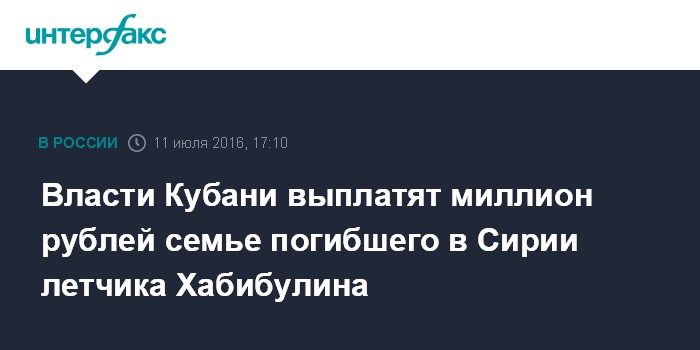 Москва. 11 июля. INTERFAX.RU - Краснодарский край окажет поддержку семье погибшего в Сирии командира 55-го отдельного полка армейской авиации полковника Ряфагата Хабибулина, сообщили агентству "Интерфакс" в пресс-службе главы региона в понедельник.