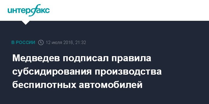 Москва. 12 июля. INTERFAX.RU - Премьер-министр РФ Дмитрий Медведев своим постановлением утвердил правила предоставления российским автопроизводителям субсидий на создание и организацию производства беспилотных транспортных средств.