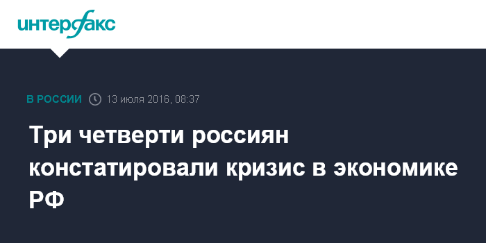 Москва. 13 июля. INTERFAX.RU - Большинство россиян (77%) согласны с мнением, что в стране сейчас экономический кризис, хотя их доля сократилась по сравнению с декабрьскими показателями на 5 процентных пунктов (с 82%), сообщили "Интерфаксу" в "Левада-Центре".