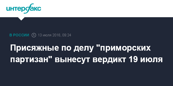 Москва. 13 июля. INTERFAX.RU - Коллегия присяжных заседателей на процессе по делу "приморских партизан" вынесут вердикт 19 июля.
