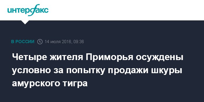 Москва. 14 июля. INTERFAX.RU - Суд в Дальнереченске вынес обвинительный приговор четырем жителям Приморья, которые в августе 2015 года пытались продать шкуру краснокнижного амурского тигра.