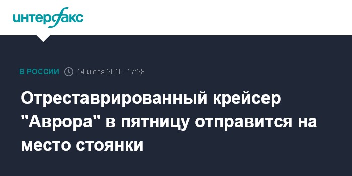Москва. 14 июля. INTERFAX.RU - Торжественная церемония отправки отреставрированного крейсера "Аврора" от АО "Кронштадтский морской завод" к месту стоянки на Петроградской набережной состоится днем в пятницу, сообщили "Интерфаксу" в пресс-службе судозавода.
