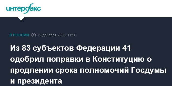 "На сегодняшний день поправки в Конституцию о продлении срока президентских полномочий с нынешних четырех до шести лет и Госдумы - с четырех до пяти лет рассмотрены законодательными органами 41 из 83 субъектов Федерации, и сегодня состоится заседание еще 13 законодательных органов субъектов, где также будут рассмотрены соответствующие поправки в Конституцию", - подчеркнула Авилова.