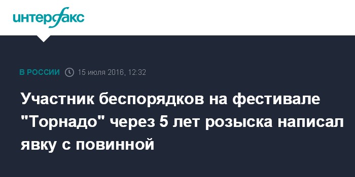 Участник беспорядков на фестивале "Торнадо" через 5 лет розыска написал явку с повинной