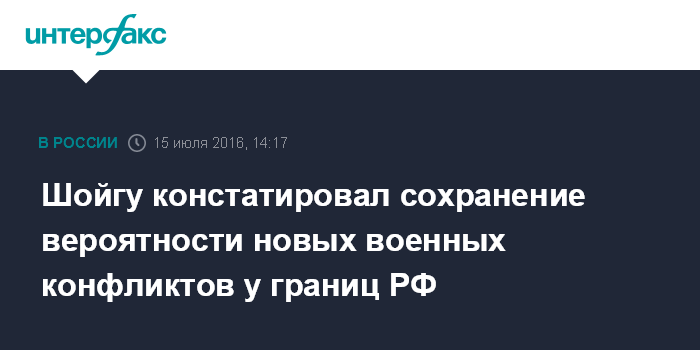 Москва. 15 июля. INTERFAX.RU - Вероятность возникновения новых военных конфликтов сохраняется, в том числе, на территории постсоветских государств Центральной Азии и Закавказья, заявил в пятницу министр обороны РФ Сергей Шойгу.
