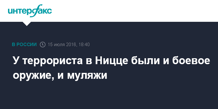 Москва. 15 июля. INTERFAX.RU - Мужчина, совершивший нападение в Ницце, располагал как боевым оружием, так и муляжами, сообщил в пятницу прокурор Парижа Франсуа Моленс.
