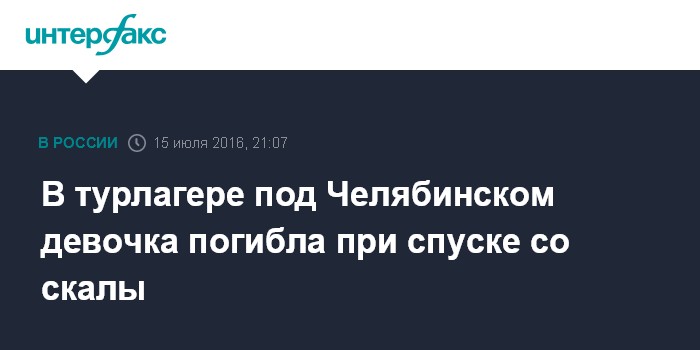 Москва. 15 июля. INTERFAX.RU - В туристическом лагере в Челябинской области при спуске со скалы погибла 13-летняя девочка, сообщил детский омбудсмен Павел Астахов.