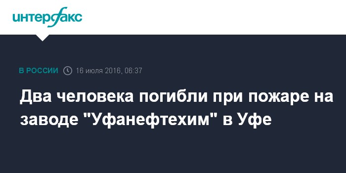 Москва. 16 июля. INTERFAX.RU - Два человека погибли, трое пострадали в результате возгорания на заводе "Уфанефтехим" (дочка "Башнефти"), сообщили агентству "Интерфакс" в пресс-службе ГУ МЧС по Башкирии в субботу.