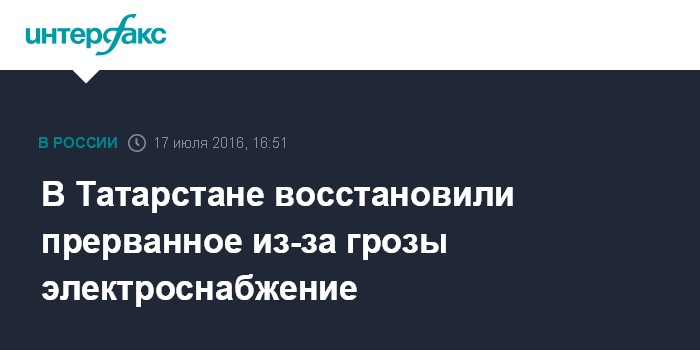 Москва. 17 июля. INTERFAX.RU - Восстановлена подача электроэнергии в четырех районах Татарстана, где в воскресенье в первой половине дня без света осталось более 24 тыс. человек, сообщает ГУ МЧС по республике.
