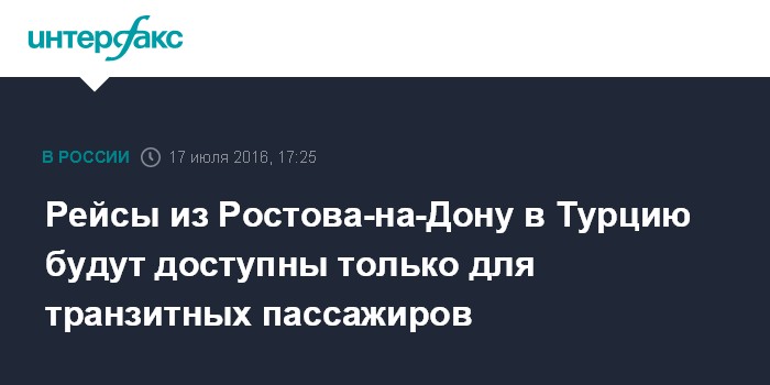 "В соответствии с требованиями российских авиационных властей, временно приостанавливается перевозка регулярными рейсами граждан России в Турцию; на рейсы из Турции данное ограничение не распространяется. Рейсы из/в Ростов-на-Дону будут выполняться по расписанию, регистрация на рейс в Турцию иностранцев и россиян, следующих через Стамбул транзитом, будет производиться в обычном режиме", - сообщила "Интерфаксу" директор департамент стратегических коммуникаций аэропорта Ольга Ладейщикова.