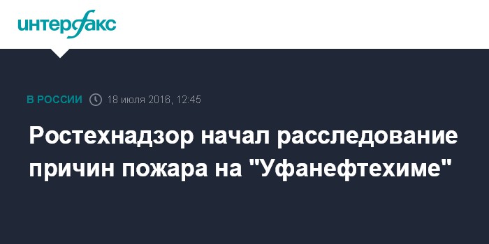 Москва. 18 июля. INTERFAX.RU - Ростехнадор приступил к расследованию причин аварии на НПЗ "Башнефти" - "Уфанефтехим", плановая проверка на предприятии была намечена на ноябрь 2016 года, сообщили "Интерфаксу" в пресс-службе Ростехнадзора.