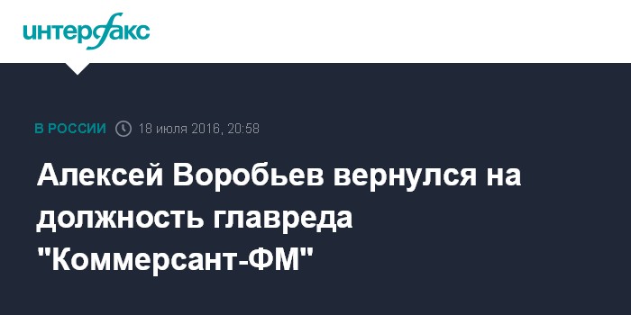 Москва. 18 июля. INTERFAX.RU - Алексей Воробьев вновь стал главным редактором радиостанции "Коммерсант-ФМ".
