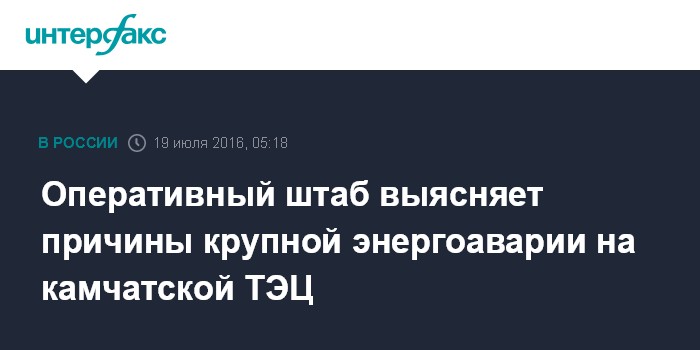 Москва. 19 июля. INTERFAX.RU - Оперативный штаб создан на Камчатке для выяснения причин энергоаварии, оставившей в понедельник без электричества почти 300 тыс. жителей региона.
