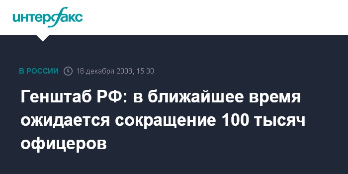 Москва. 16 декабря. INTERFAX.RU - Около 100 тысяч офицеров будет сокращено в самое ближайшее время, заявил начальник российского Генштаба, генерал армии Hиколай Макаров.