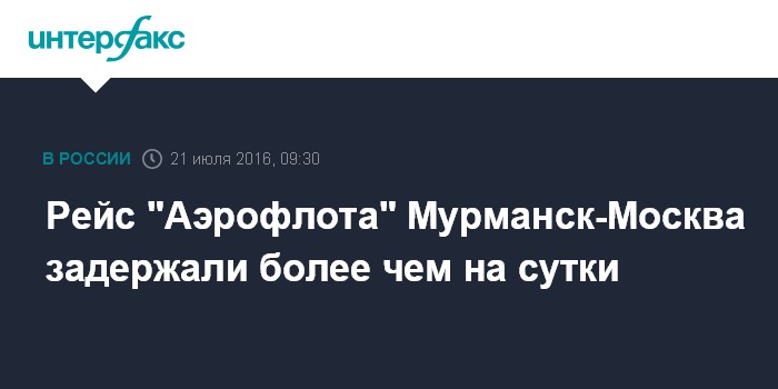 Москва. 21 июля. INTERFAX.RU - Рейс "Аэрофлота" Мурманск-Москва, запланированный на 02.55 в среду, задерживается больше, чем на сутки.